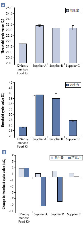 图3. 高产量DNA 和极低的抑制剂残留。使用DNeasy mericon Food Kit 及来自其他3 家供应商的试剂盒,以标准实验方案处理花生酱和巧克力(困难且高度抑制性的食品基质),以扩增叶绿体trnL tRNA 基因。A 与其他试剂盒相比,DNeasy mericon Food Kit 所制备样本的阈值循环数(CT)较低。B 用纯化后DNA 进行操作,当样本以1:10 稀释时,此分析产生了2.9–3.5 的CT 变化。较低的变化则说明PCR 抑制剂的存在。样本以1:10 稀释,且扩增相同的DNA 片段。DNeasy mericon Food Kit 制备的洗脱液不含抑制剂,如图中所示CT 变化大约为3。其他试剂盒制备的洗脱液则表现出程度较大的抑制剂污染。所有数据都以固定的样本量标准化,以避免试剂盒起始量、稀释步骤和洗脱体积的差异。