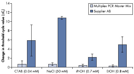 | 图4. 对抑制剂的高度耐受性。携带有人工DNA 序列的质粒(DNA model TaqMan® System;108 个拷贝) 在加标有抑制剂的反应中扩增, 其中还加入了mericon PCR Assays 中的Multiplex PCR Master Mix 或供应商AB 所提供的master mix。选择了不同的抑制剂和浓度,以便模拟传统样本制备方法可能残留的污染。将每个反应的阈值循环数与阴性对照(在PCR