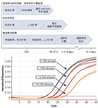 PCR,为这些经典方法提供了内容丰富的补充。此外,real-time PCR 检测在更短时间内带来结果(图5),提供了更高的灵敏度和特异性,以及处理困难食品基质的可靠性(图6)。总之,real-time PCR 是一种检测困难病原体菌株的安全方法。图5. 不同病原体检测方法的时间比较。real-time PCR 分析不仅带来了灵敏且高特异性的结果,而且比传统的病原体检测方法更快。免疫分析和传统的培养方法所需时间长,不够灵敏,也耗费更多人力。 |