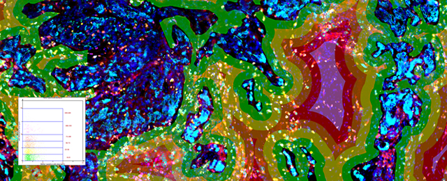 TissueFAXS Cytometry组织流式定量分析技术根据识别到的肿瘤轮廓,结合实验需要,实现以微米为尺度寻找肿瘤内外不同距离范围内目的细胞的功能。可定义的识别的标准包括核/质/膜的各种形态及染色,也可以包括双标/三标乃至无上限标记数量的共表达目的细胞。通过精确定量微环境中发挥不同功能的特定细胞及其位置,找到不同实验组中的差异趋势。