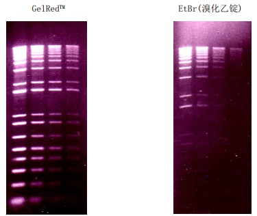 GelGreen和SYBR Green I相比有同样的灵敏度,却有更高的稳定性