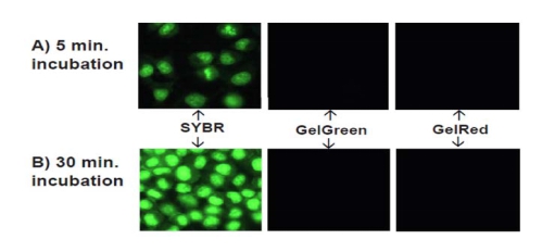 图3:分别用1X SYBR Green 1、SYBR Safe、GelRed 和 Gelgreen 在 PBS 缓冲液中对Hela 细胞染色5分钟和30分钟。成像结果表明Gelred和GelGreen染色剂几乎没有穿透细胞膜进入细胞内,而SYBR Green 1、SYBR Safe 则完全进入细胞内,并与核酸结合(绿色发光 部分)。这充分证明GelRed和GelGreen具有极好的安全性。更详细的安全检测报告可以到 www.biotium.com 官方网站下载。 |