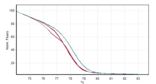 图 2 . 在 Rotor Gene 6000 上使用 EvaGreen 进行高分辨率熔解曲线( HRM)分析可以明显的区分三个不同的基因型:突变型(红色)、杂合型(紫色)和野生型(蓝色)。(数据由 Corbett Research 提供) |