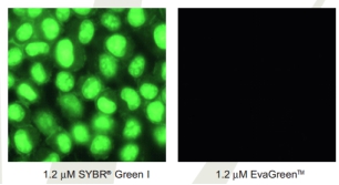 图 5. 在37℃下分别用SYBR™ Green I(1.2μM,左图)和EvaGreen™(1.2μM,右图)孵育Hela细胞并用荧光显微镜观察。30min内未观察到EvaGreen™ 染色细胞。但SYBR™ Green I孵育5min后观察到明显的细胞染色(数据未提供)。30min后,SYBR™ Green I组细胞核内观察到大量绿色荧光(左图)。SYBR™ Green I能快速进入细胞,加上它已知的诱变增强性(Ohta et al. Mutation Research 492, 91(2001)),使它在常规PCR操作中存在潜在毒性。相反,EvaGreen™ 似乎完全没有细胞膜透性,这至少部分解释了艾姆斯氏测试中无诱变性无细胞毒性的结果。(EvaGreen™ 完整的安全性报告可以从Biotium网站上下载) |