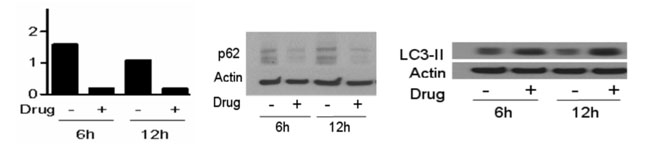 自噬诱导药物处理人乳腺癌细胞。经药物处理6小时和12小时后,细胞裂解,使用p62 ELISA试剂盒定量检测、p62抗体和LC3-II抗体进行免疫印迹。经药物处理后,自噬标记物表达水平有变化,p62蛋白水平降低(A和B图),LC3-II水平上升(C图)