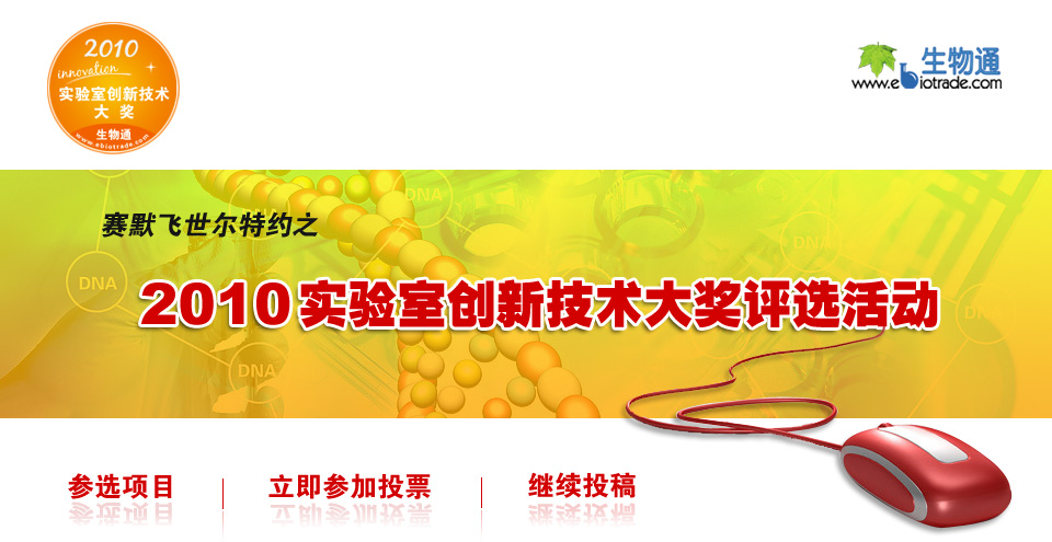 创新,可以很细微,可以很壮阔;创新,无论大小,只论新锐,它犹如燎原的星星之火,用智慧的薪火点亮新技术之光;它是生命科技进步的灵魂。生物通主办的“赛默飞世尔特约之2010实验室创新技术评选活动”寻找下一个“创新达人”,分享你的创新智慧,让智慧之花在细微处绽放,让智慧在创新中得到永生。 此次“赛默飞世尔特约之2010实验室创新技术大奖”评选活动的主要目的是为了能鼓励更多的实验改进,帮助研究人员共享更多的实验小技巧。经过一段时间的投稿,我们已经获得了不少项目,这些项目中有的能减少实验步骤,有的能降低实验成本,还有一些改进了实验设备,让我们的实验过程更加轻松。 目前这一活动已进入投票阶段,您认为这些项目中哪些能帮助到您,哪个项目的创意令人印象深刻,快来给您心仪的创新技术投上一票!当然如果您还有其它的创新实验技巧,欢迎继续来稿,让更多的人了解并用到您的实验技巧!