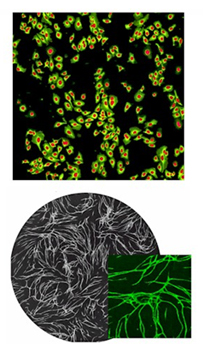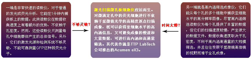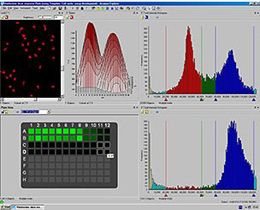Acumen eX3通过一个宽视野镜头以激光扫描培养有贴壁细胞的微孔板或玻片的底部, 这些细胞根据实验要求已事先用各种荧光探针标记,被激光激发的荧光标记物发射出高能量的荧光, 被4个光电倍增管(PMT)分别收集,并读取信号强度。之后通过阈值算法除去实验的背景噪声,并鉴别出所有的有效荧光信号进行自动化的目标识别,也即根据高分辨率的信号勾勒出详细的细胞数量、形态、状态或蛋白在细胞中的状态等。再通过智能算法将这些数据转换成与实验目的相关的定量数据,从而评价药物在细胞和组织水平的功效。这成为业界评价药物生物学活性最行之有效的方法之一。 |