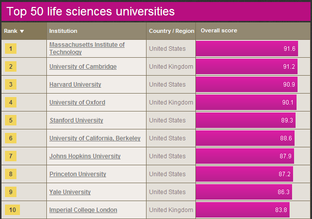 顶级大学生命科学类亚洲区域排名 在USNews目前的排名中,生命科学分类的亚洲地区排在第一的是香港科技大学,第二是香港大学,其次是新加坡国立大学,东京大学,香港中文大学,韩国首尔大学,京都大学,大阪大学,日本东北大学以及日本东京工业大学…… 2012高校学术排名(生命科学) 2012最佳学术研究院排行榜 2012中国两岸四地大学ESI论文排行榜