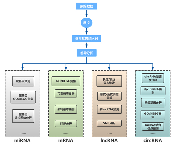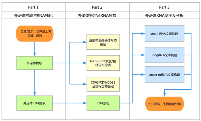 外泌体中包含mRNA、miRNA、lncRNA、circRNA等多种RNA分子,不同类型细胞所分泌的外泌体包含的RNA分子不同,这些RNA分子以外泌体为载体进入靶细胞后,会通过不同的机制对靶细胞产生影响。通过高通量测序技术分析外泌体RNA分子差异,是对外泌体RNA功能研究的有效手段。