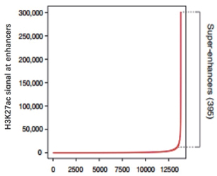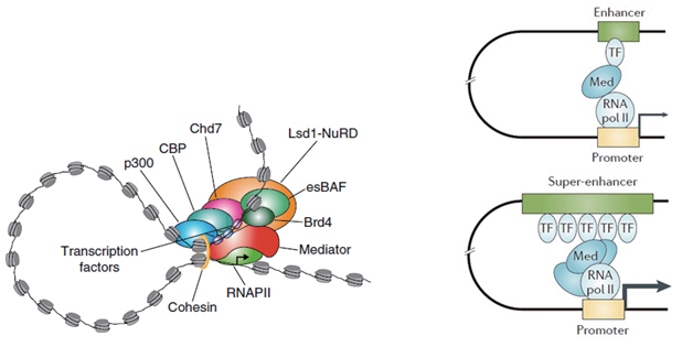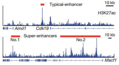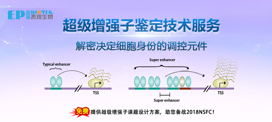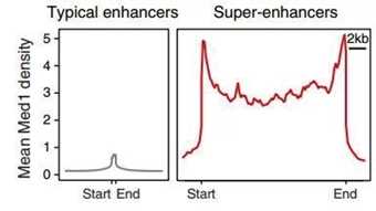 超级增强子 (Super enhancer, SE) 是一类具有超强转录激活特性的顺式调控元件,2013年由美国学者Richard A. Young首次提出。与普通增强子 (Typical enhancer, TE) 相比,超级增强子区域跨度范围通常可达8~20Kb,远高于普通增强子的200~300bp跨度范围。更重要的是,超级增强子比普通增强子具有更强的转录激活相关组蛋白修饰 (H3K27ac等)、辅因子 (Mediator等) 及转录因子富集密度。以上特点决定超级增强子具有强大的调控功能。