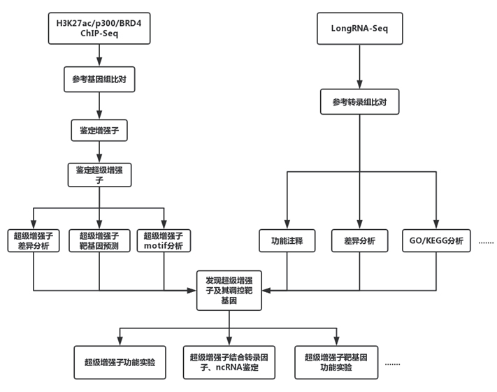 超级增强子的鉴定,依据的是增强子转录活性标记分子结合水平强度的差异,这些分子包括辅因子 (如Mediator和cohesin)、组蛋白修饰标记 (如H3K27ac和H3K4me1)、染色质修饰分子 (如p300) 等。在鉴定过程中,首先通过ChIP-Seq分析这些增强子转录活性标记分子在基因组上的富集情况,确定活性增强子位点。之后再对所有活性增强子进行分析,鉴定得到超级增强子。通过与转录组测序数据进行关联分析,可发现超级增强子所调控的靶基因。![]() |