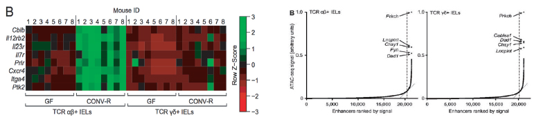 本项研究对小鼠肠道 αβ + 和 γ δ + 上皮内淋巴细胞进行了ATAC-seq,再通过鉴定普通增强子和超级增强子靶基因,揭示了被微生物影响的信号通路网络、代谢通路和增强子相关转录因子。这项研究的结果证明研究遗传修饰有助于鉴定宿主免疫细胞系中的微生物群落相关的功能特征。