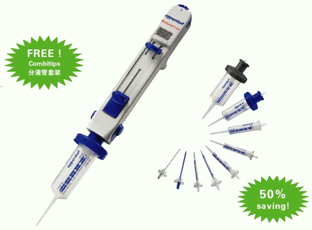 · 购买一支Multipette plus 连续分液器连续分液器,赠送1盒普通级Combitips分液管套装,含9种不同量程分液管各5个,以及25ml和50ml两个适配器