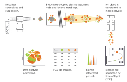 Standard BioTools质谱流式技术 (Mass Cytometry,也称CyTOF),是一种高通量单细胞蛋白质分析技术。它利用稀有金属标签抗体标记细胞表面和内部的蛋白标志物,通过质谱的方式进行单细胞分析(图 1)。由于采用稳定的金属标签和质谱检测系统,质谱流式各检测通道之间几乎没有重叠,背景可以忽略不计。质谱流式可以轻松实现单个细胞超过 40 种蛋白的同时检测,系统全面地分析病理状态下各类免疫细胞在表型和功能上的变化,从中发现一些新的免疫细胞亚群、揭示新的免疫机制,解析病原体与宿主细胞的相互作用网络。