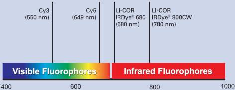 传统的荧光染料由于激发和检测波长位于可见光谱区域,易形成介质(NC膜、PVDF膜、尼龙膜、孔板、培养皿、组织等)的自身荧光,即导致高背景信号,因而不能有效地用于检测膜、孔板、培养皿、或者组织上的蛋白。由于在红外光谱区域(670-1100nm),这些介质基本无自身荧光,因此红外波长检测蛋白具有低背景、高灵敏度、高信噪比的优点。