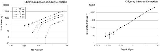稀释小鼠抗体作为抗原,分别用HRP偶联或红外染料标记的羊抗鼠二抗检测。化学发光采用ECL底物和CCD检测不同曝光时间的结果;而红外荧光结果在Odyssey一次扫描完成。结果线性准确度上化学发光因曝光时间不同而差异很大,而Odyssey线性关系相对比较好;线性范围上化学发光是250倍,而Odyssey达到了4000倍。 |