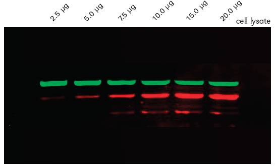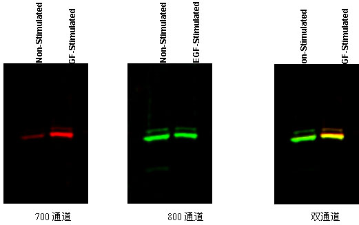在一张印记杂交膜上的双色Western Blot蛋白分析,会得到更快更准确地蛋白磷酸化(或其它修饰化)的检测结果(如图),排除了由于分别两次实验造成的分析结果误差。高清晰的成像也使得发现由于蛋白修饰而引起的迁移率漂移变得更加容易。