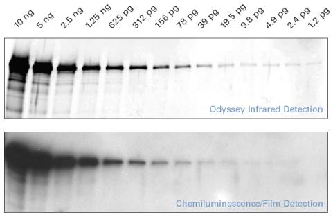 针对Western blot,Odyssey是唯一灵敏度可达到皮克级(pg)的荧光系统,其检测效果优于化学发光法。
