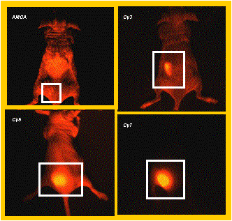 通过将结合有IRDye800CW红外染料的探针注入小动物体内,探针特异性的结合到活体内的目标区域,激光激发发后,扫描检测荧光信号并计算其强度,从而研究蛋白在活体内的定位和功能。