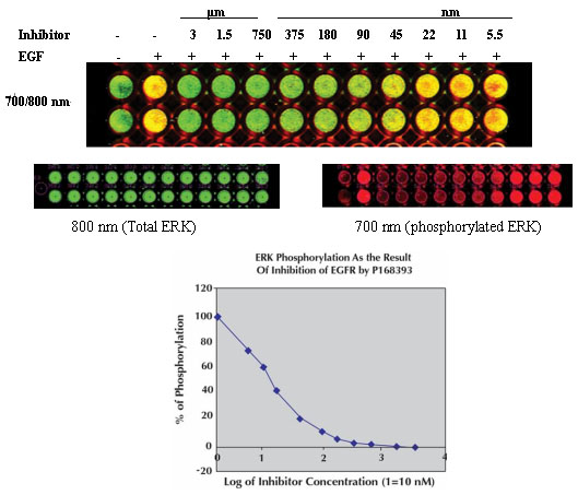 观察EGF刺激后A431细胞中ERK1 and ERK2 (p44/42 MAP kinases)的磷酸化情况, 一抗分别是兔抗ERK抗体和小鼠抗磷酸化ERK抗体,二抗用 抗兔的IRDye800 标记的抗体 (green),和抗鼠的 Alexa680 标记的抗体 (red) |