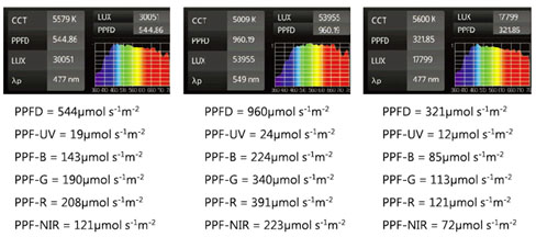 太阳光谱一整天都在改变而植物却不会在同时间反应出来,在黎明、正中午或者黄昏时。做为证明请参考以下几个测量,在一天中不同时期下所做的测试:9:00am 11:00am 1:00pm |