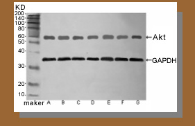 左图: A-G分别表示不同实验小鼠心脏蛋白(上样量50ug),兔抗小鼠Akt抗体(Cat#KC-5A01)检测心脏组织匀浆中Akt水平。加入兔二抗(Cat#KC-RB-035)时同时加入HRP标记的抗GAPDH单抗(稀释比例为1:10,000,Cat#KC-5G5)。采用化学发光试剂盒(康成生物Cat#KC-420)及X胶片曝光显影。一次反应即可同时检测目的蛋白(Akt)与内参GAPDH的含量。