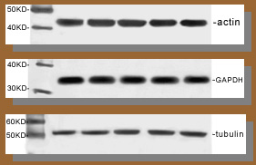 右图:A-E分别表示细胞株ELC、U937、HSC、SPCA、W304总蛋白(上样量30 μg / 泳道),HRP标记β-actin单抗、HRP标记抗GAPDH单抗、HRP标记β-tubulin单抗稀释比例均为1:50,000,室温孵育1小时。超敏化学发光底物A 50 μl + 底物B 50 μl混合,稀释至1 ml。孵育3 min,曝光时间30 Sec。 |