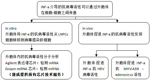 通过Agilent表达谱芯片和Exiqon miRNA芯片等实验,发现干扰素-a处理的LNPCs分泌的外胞体富含抗病毒的mRNA和miRNA。LNPCs来源的外胞体被肝细胞内吞,实现抗病毒分子在细胞间的传递;进一步实验发现,在小鼠活体实验中,外胞体参与了干扰素-a抗鼠肝炎病毒A59和腺病毒的抗病毒反应。