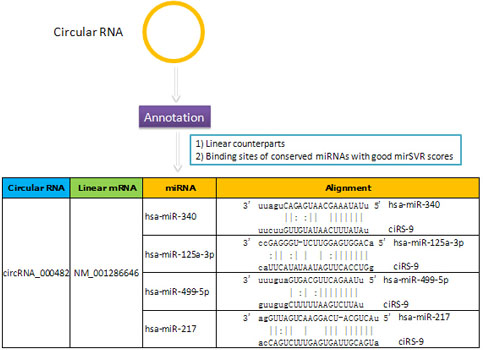 所有circRNA均经过生物信息学分析,预测其结合的microRNAs,并在实验报告中明确这些注释信息(如下图所示)。根据这些信息,客户可以很方便的从miRNA海绵的角度研究circRNA的作用机制和生物功能。