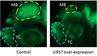 图3. 斑马鱼胚胎过表达ciRS-7(右图)会导致中脑(MB)缩小,而端脑(TC)大小不受影响。