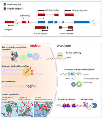 图 1. 根据LncRNA和蛋白编码基因的不同位置关系进行分类 (顶部)。LncRNAs可以通过不同机制调控基因表达,例如招募染色质重构复合体,在表观层面调控基因表达;作为增强子促进mRNA表达;影响核内亚结构 ;影响核质转运过程;通过miRNAs介导的ceRNA机制发挥作用; 影响mRNA的稳定性及翻译;通过顺式或反式调控的方式,在转录或转录后水平发挥调控作用 (底部)。 |
