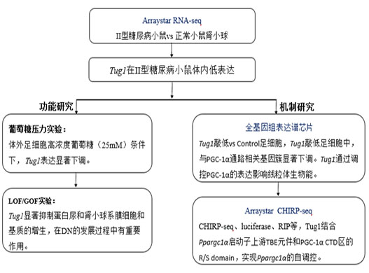 美国德克萨斯大学安德森癌症研究中心Farhad R. Danesh教授主要从事肾脏病理的基础与临床研究。近期,其实验室通过Arraystar RNA-seq发现lncRNA分子——Tug1在糖尿病小鼠体内低表达。表达谱芯片及Arraystar CHIRP-seq等证明,Tug1能够直接结合PGC-1α和Ppargc1α 上游启动子区TBE元件,促进Ppargc1α基因表达,并最终影响糖尿病患者足细胞线粒体生物能。该研究成果刊登在国际顶级医学期刊Journal of Clinical Investigation(IF=12.81)。(RNA-seq、表达谱芯片、CHIRP-seq由Arraystar提供技术服务)
