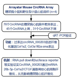 为了研究circRNA在糖尿病心肌纤维化中的作用。本次研究应用美国Arraystar Mouse CircRNA芯片筛选糖尿病小鼠和正常小鼠心肌组织中差异表达的circRNA。发现76个circRNA在糖尿病小鼠和正常小鼠心肌组织中差异表达,其中45个circRNA表达上调,31个circRNA表达下调。用qRT-PCR验证芯片结果。过表达circRNA_000203可以促进心肌纤维化基因Col1a2、Col1a3和α-Sma表达。RNA pull down和luciferace reporter等体外实验证实circRNA_000203-(miRNA-26b-5p)-Col1a2/CTGF通路调控心肌细胞纤维化。