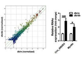 | 图一:左:circRNA芯片筛选circRNA散点图(fold change>2);右:qPCR验证circRNA-000203在心肌组织中表达升高,与芯片结果相符。 |