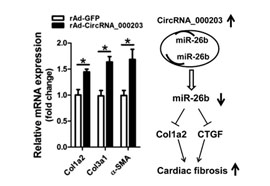 CircRNA_000203 enhances the expression of fibrosis-associated genes by derepressing targets of miR-26b-5p, Col1a2 and CTGF, in cardiac fibroblasts.