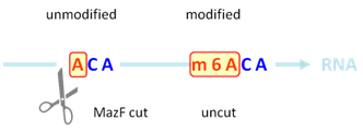 图 1. MazF可以在非甲基化ACA位点切割,而无法在甲基化m6ACA位点发挥作用