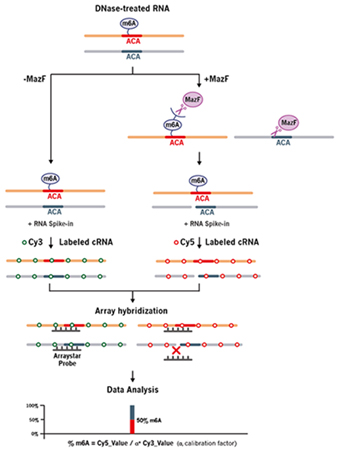 RNA内切酶MazF识别RNA单链并在非甲基化的ACA位点的5’端进行切割,而不能切割甲基化的m6ACA位点(图1) [1, 10]。将抽提的总RNA样本分为两份,一份不加MazF处理,标记上Cy3荧光,另一份加MazF处理后,标记上Cy5的荧光。标记好后的RNA样本合并在一起与Arraystar m6A单碱基分辨率芯片杂交,从而定量分析每个位点的m6A修饰百分比和丰度(图2)。