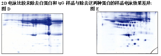 图 D:采用未经处理人血浆样品;图 E:使用ProteoExtract Albumin/IgG Removal Kit除去白蛋白和IgG的人血浆样品。当样品中高丰度的白蛋白和IgG被试剂盒除去后,使得多种先前未能显示的蛋白被检测出来 |
