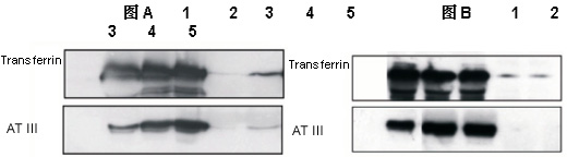 | 图. A and B:Western-Blotting验证ProteoExtract Albumin/IgG Removal Kit试剂盒去除白蛋白和IgG的效率。由于试剂盒提供的两种树脂洗脱条件的差异,样品可以单独去除白蛋白(图 A)或单独去除IgG(图B)。样品按试剂盒说明书操作步骤处理,1D-SDS-PAGE电泳,并以Transferrin(上面条带)和Antithrombin III(下面条带)的抗体进行Western检测。Lane 1:15ug人血浆蛋白;Lane 2&3:15ug穿过组份蛋白;Lane 4&5:15ug洗脱组份蛋白。 |