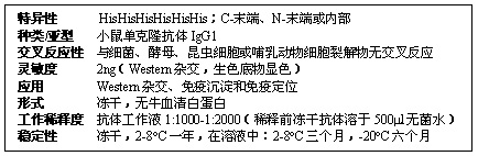 His• Taga单克隆抗体为小鼠单克隆抗体(IgG1),抗许多Novagen表达载体或许多其它商品化载体编码的His• Tag序列。该抗体识别五个连续的组氨酸残基,而不受邻近氨基酸组成的影响。高亲和力(Kd=5′10-8-1′10-9M)使得可在抗体浓度为0.1mg/ml时灵敏特异地检测His• Tag融合蛋白。 His• Tag单克隆抗体结合N-末端、C-末端和内部His• Tag序列。