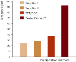 平行检验不同蛋白沉淀方法所沉淀的蛋白,经SDS-PAGE电泳,考马斯亮蓝染色,与原肝组织抽提物进行比较。结果显示TCA/DOC方法、另两家供应商产品所获得的蛋白沉淀与ProteoExtract™蛋白沉淀试剂盒相比,有明显损失。