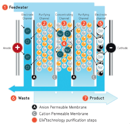 - 剩余离子被Elix® 电去离子模块去除,Elix® 中的离子交换树脂通过一个电场进行连续再生。不需要进行有害的化学再生或昂贵的树脂更换。