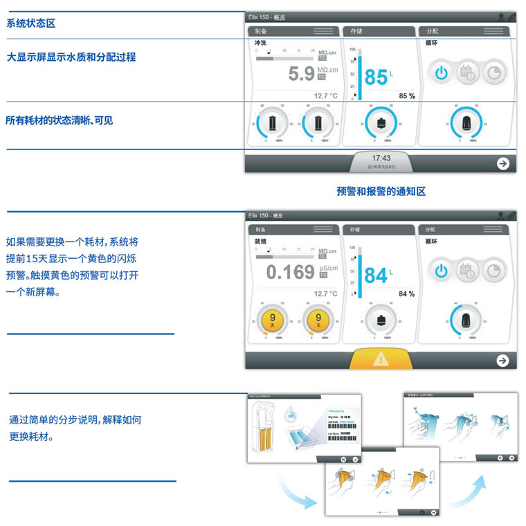 通过Elix® 智能化水纯化系统的众多可调设定点(设计目的是在出现偏差时,触发预警或报警),提供了风险管理。该前瞻性方法最大限度延长了系统的正常运行时间,防止故障,以确保实验室用水。