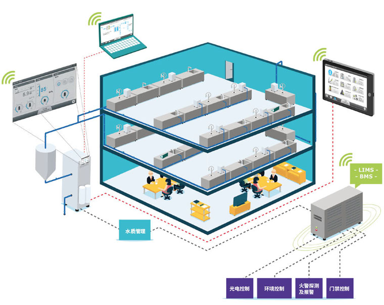 Elix® 智能化水纯化系统可使用个人电脑或平板电脑进行远程控制,连接到实验室信息管理系统(LIMS)或楼宇管理系统(BMS)。