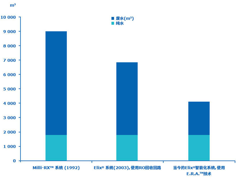 Elix® 智能化系统采用专利Elix® 技术,该技术提供恒定水质,而无需树脂柱、软化剂或调节系统。此外,新整合的E.R.A.™技术基于进水水质,自动优化水回收率,以减少自来水用量(可达50%),降低成本。RO回收回路将要排放的弃水回收利用,优化了耗水量,从而进一步减少水的浪费,并延长了RO膜和Progard® 柱的使用寿命。