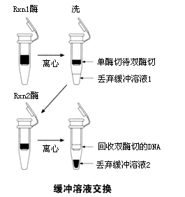常常推荐使用的方案是透析和乙醇沉淀,然后在限制酶切DNA片段之前洗涤,干燥步骤。经常,用两种或者两种以上的酶酶切DNA底物时,需要用不同的酶切缓冲液,满足不同酶对反应缓冲液的要求(图六)。不连续的恒容过滤(一系列的浓缩和溶解步骤)能够用来简单有效地从DNA样品中去除小分子污染物和盐。这个流程是关于系列限制酶切的,这个基本的去盐/缓冲液交换流程可以改动以适合不同的应用。