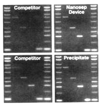 我们的数据显示用Nanosep 100K的装置回收的DNA从带的亮度看来,大于90%。四个不同的分子量带代表相互独立的试验。沉淀的DNA带也有很高的产率,但是会有很多胶缓冲液污染物,这些污染物不会出现在超滤的DNA样品中。其他对照组的装置的回收率普遍更不可靠,从0到80%。一种常见的对照装置常常有大约十分之一的不能很好的密封。