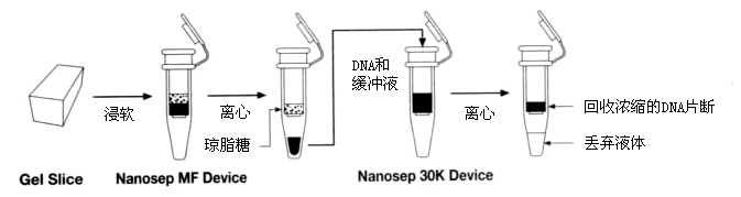 从胶块里分离纯化DNA片段可以通过两个简单步骤完成。第一步,DNA从胶块里溶解出来。琼脂糖凝胶胶质通过一个有0.2到0.45uM膜的离心管,然后胶液(含有DNA)自由地流过。第二步,DNA片段用有合适MWCO值(见表三)足以截流DNA