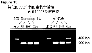 3、超滤,涉及到用分子大小排阻的膜分离浓缩PCR产物(图十二)。这个方法快速,操作少,产率高,DNA不损伤,浓缩的DNA没有阻抑下游发应的污染物(图十三)。