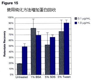 降低蛋白质在表面的吸附性的损失的策略既在于表面的预先处理以填满暴露的位点又在于改变溶液的构成,例如加入蛋白(常常是清蛋白),去垢剂,或者盐。在大多数情况下,在浓缩稀蛋白溶液之前预处理(钝化)柱子可以提高回收率(图五)。